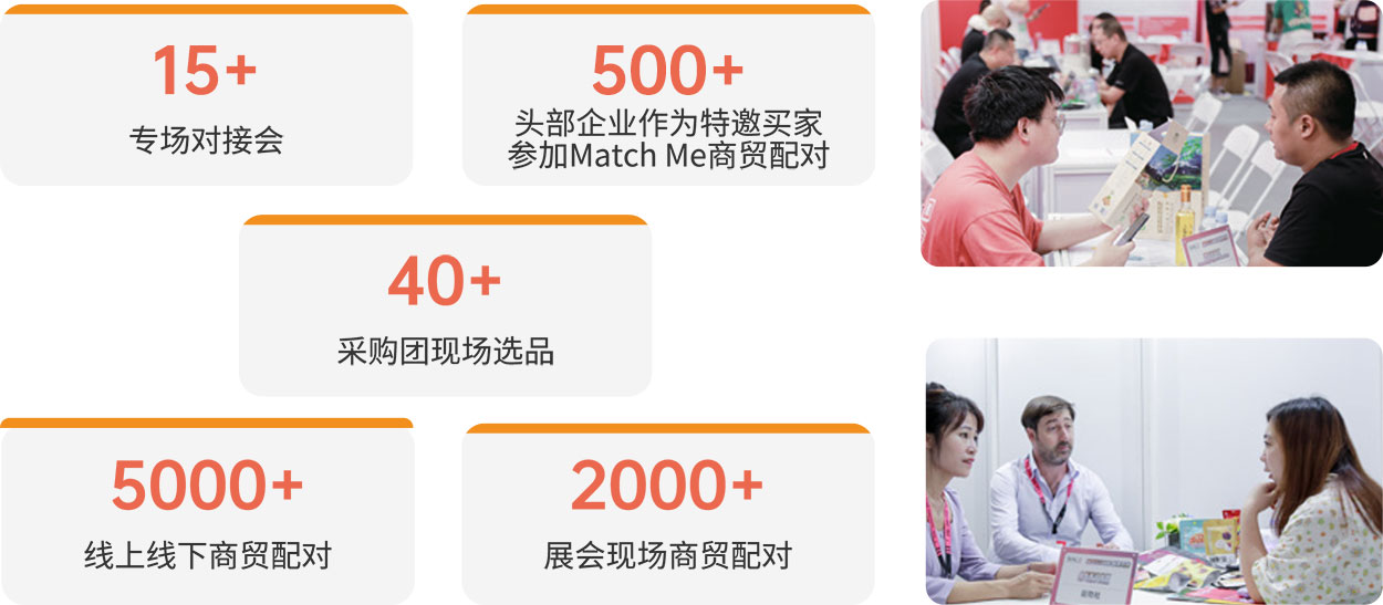 | 2023 SIAL 西雅展(深圳)為 600+ 展商和 500+ 特邀買家提供 Match Me 供需對接服務(wù),通過展位配對、團(tuán)長選品區(qū)、大買家洽談間和對接會等多種形式為供需雙方成功搭建精準(zhǔn)、高效的貿(mào)易橋梁,現(xiàn)場共完成 5000+ 商貿(mào)配對場次。 |