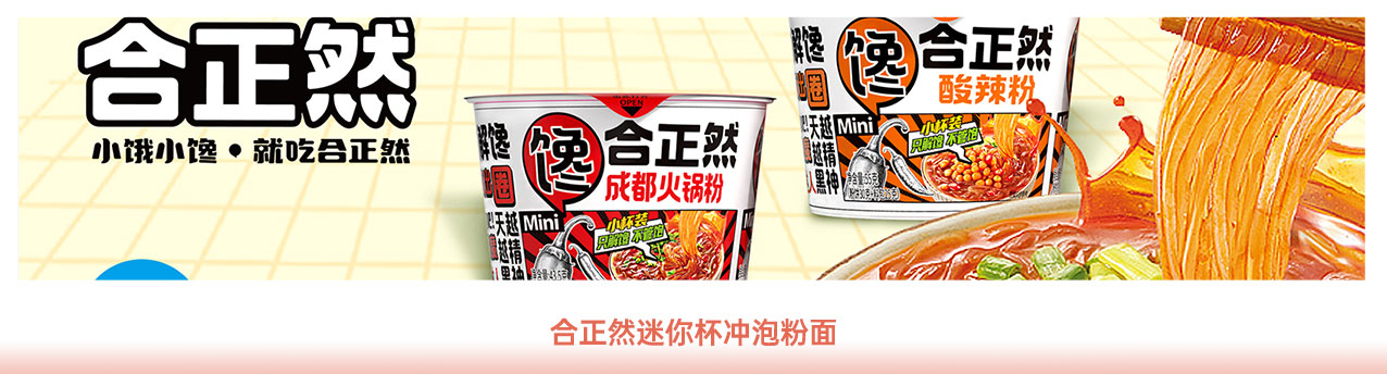 | 「合正然」品牌創(chuàng)立于2023年,以“小餓小饞 就吃合正然”為品牌理念,致力于打造:速食零食化、低客單高性價比的全品類潮流速食。目前已開發(fā)出“饞”、“鮮”、“爽”、“飯”、“燙”五大系列方便食品。