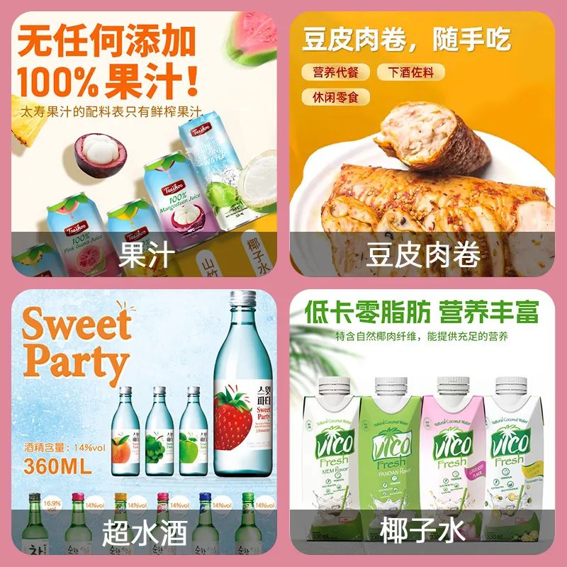 超水燒酒在韓劇中出鏡率極高,可以說是國民必備小酒,口感柔和、清爽,原料里添加的木糖醇和蜂蜜,掩蓋了燒酒本身辛辣苦澀的味道,果香濃郁,喝起來甜味兒更足!太壽100%椰子水由越南最大的椰子加工公司ACP出品,選用產自湄公河三角洲"椰子之都"檳枷省自然成熟的優質椰子。太壽100%果汁的原料水果全部選自越南當地水果產區的成熟新鮮水果。越南是熱帶季風氣候,光照充足,雨量充沛,特別適合熱帶水果生長,產出的熱帶水果口味極佳。豆皮肉卷遵循傳統,手工卷制,秘制鹵汁腌制,果木熏烤,非油炸更健康,葷素搭配,口感豐富,營養美味。