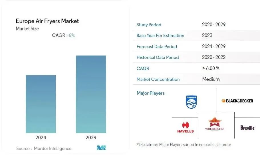 在歐洲情況有些相似。在關于空氣炸鍋市場規模的第三份Mordor Intelligence報告中,分析師指出,歐洲的空氣炸鍋市場今年已創造了7.9679億歐元的收入,預計在預測期內將實現超過6%的復合年增長率。