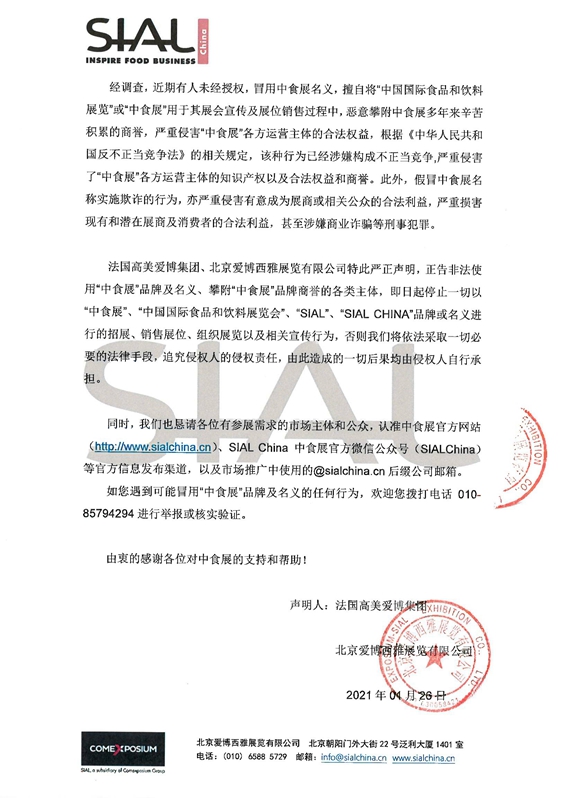 法國(guó)高美愛(ài)博集團(tuán)、北京愛(ài)博西雅展覽有限公司特此嚴(yán)正聲明,正告非法使用“中食展”品牌及名義、攀附“中食展”品牌商譽(yù)的各類(lèi)主體,即日起停止一切以“中食展”、“中國(guó)國(guó)際食品和飲料展覽會(huì)”、“SIAL”、“SIAL CHINA”品牌或名義進(jìn)行的招展、銷(xiāo)售展位、組織展覽以及相關(guān)宣傳行為,否則我們將依法采取一切必要的法律手段,追究侵權(quán)人的侵權(quán)責(zé)任,由此造成的一切后果均由侵權(quán)人自行承擔(dān)。