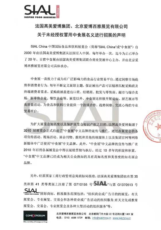 關(guān)于未經(jīng)授權(quán)冒用中食展名義進(jìn)行招展的聲明 法國(guó)高美愛(ài)博集團(tuán)、北京愛(ài)博西雅展覽有限公司