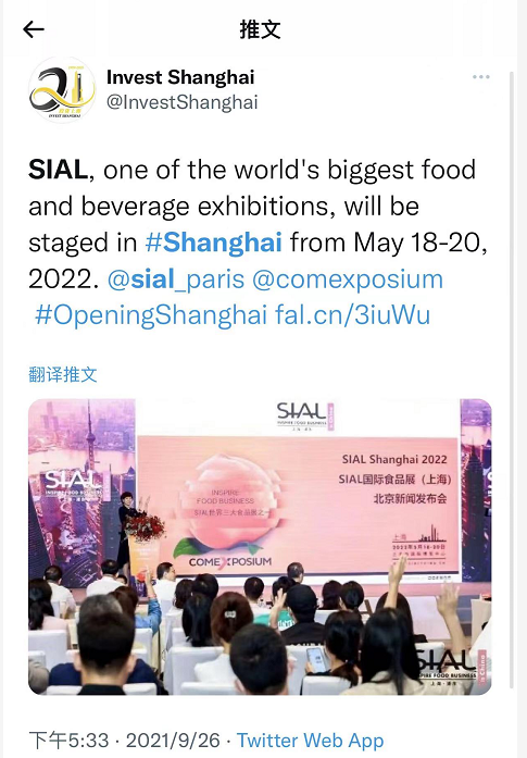 上海外商投資促進服務平臺(Invest Shanghai)為SIAL 2022 國際食品展(上海)點贊