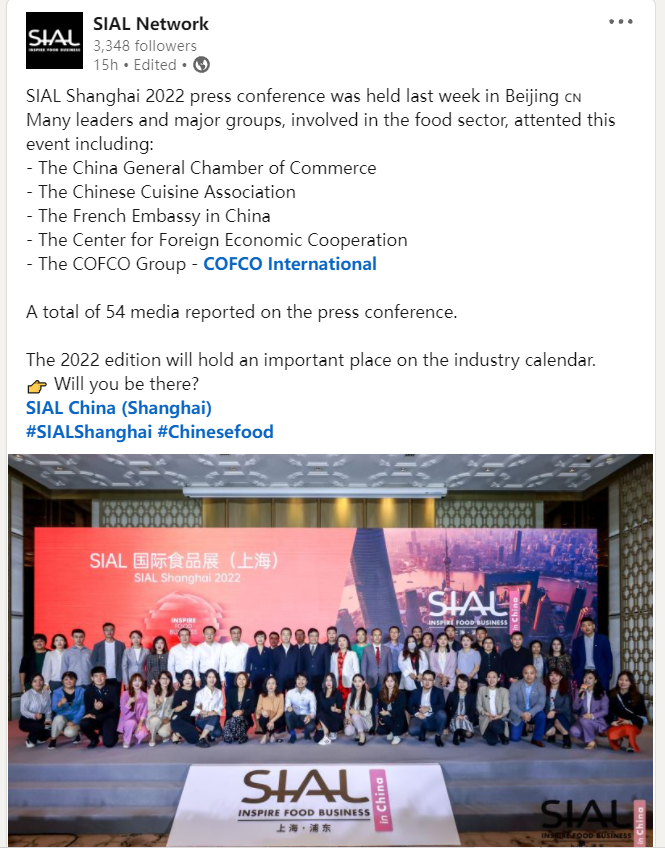 SIAL 2022 國際食品展(上海)在SIAL全球食品展官方LinkedIn賬號上獲得了法國、巴西、羅馬尼亞、阿根廷、阿聯酋、土耳其等國家食品品牌、貿易代表、合作伙伴的點贊