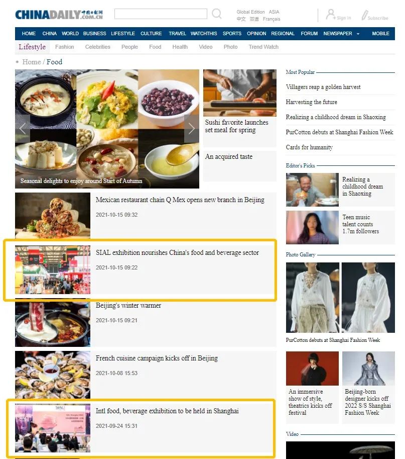 SIAL國際食品展(上海)——SIAL世界三大食品展之一、一年一度世界食品全產業鏈大會——獲中國最具影響力的英文網站China Daily重點報道,登上了其食品板塊的首頁。