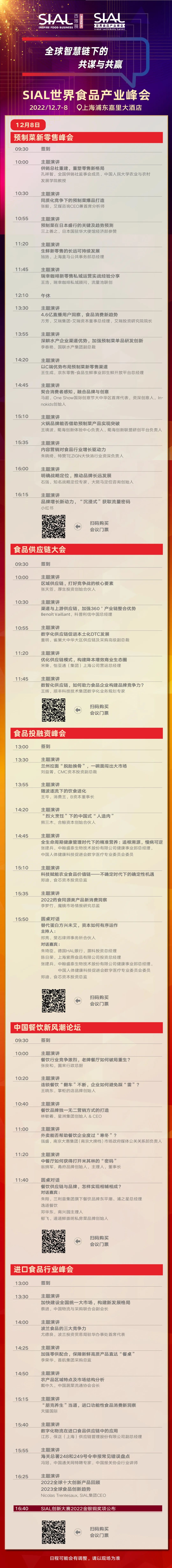 SIAL世界食品產業峰會將于2022年12月7日-8日如期舉辦!峰會將以“全球智慧鏈下的共謀與共贏”為主題舉辦包含預制菜、新零售、供應鏈、農業食品科技、食品投融資、營養健康食品、植物性食品、乳業、肉類、飲品、中餐、進口食品在內的多場主題論壇。
