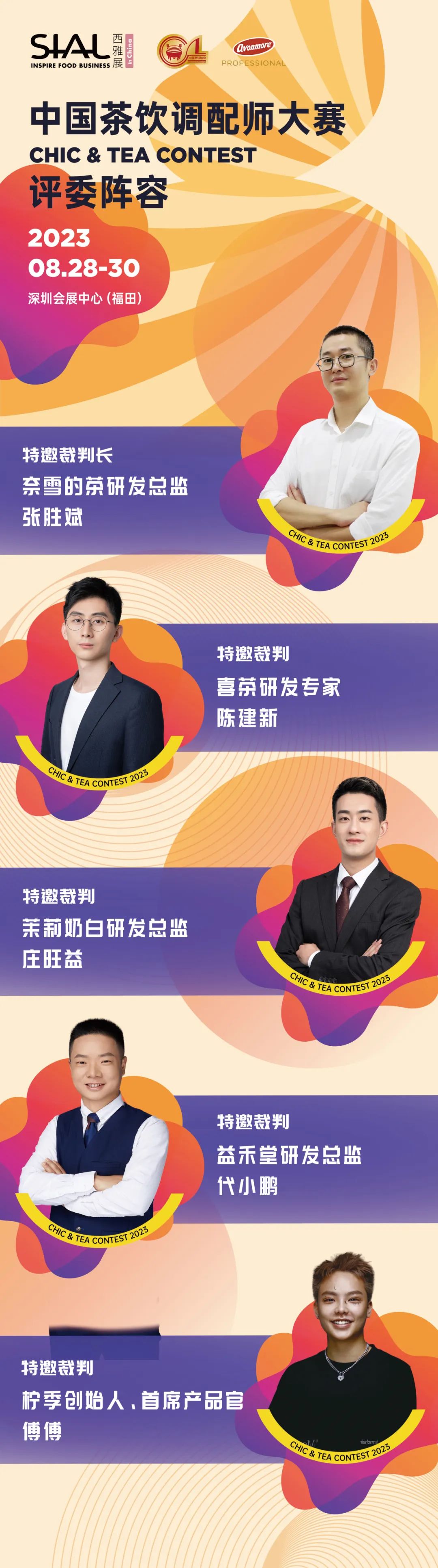 喜茶、奈雪的茶、益禾堂、檸季、茉莉奶白共計5位品牌創始人、研發負責人將出席第二屆SIAL中國茶飲調配師大賽,作為特邀裁判組成專業裁判團隊,對競技選手進行專業評判與打分,確保比賽公平公正,評選出優秀的茶飲調配師及茶飲作品。