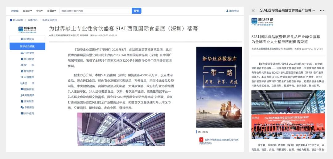 9-10月,“一帶一路”綜合信息服務平臺“新華絲路”資訊板塊接連發布《SIAL國際食品展暨世界食品產業峰會落幕 為全球專業人士精準匹配供需渠道》、《為世界獻上專業性食飲盛宴 SIAL西雅國際食品展(深圳)落幕》兩篇文章對于2023 SIAL西雅展(深圳)進行報道。