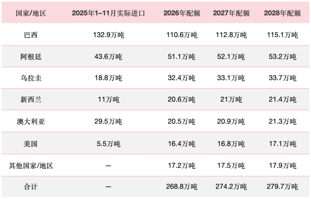 近年來(lái),隨著消費(fèi)升級(jí)與健康飲食觀念普及,國(guó)內(nèi)對(duì)優(yōu)質(zhì)蛋白需求持續(xù)增長(zhǎng),帶動(dòng)牛肉進(jìn)口量顯著上升。數(shù)據(jù)顯示,2024年牛肉進(jìn)口量較2019年大幅增長(zhǎng)73.2%。進(jìn)口牛肉憑借其成本與品質(zhì)優(yōu)勢(shì),已成為中國(guó)市場(chǎng)重要的供給組成部分。2026年-2028年主要供應(yīng)國(guó)配額如下: